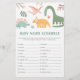 Invite your loved ones to celebrate your upcoming little miracle with our Dinosaur Baby Shower Game. Crafted with love, this delightful range of invitations is perfect for both baby boys and baby girls, as we've designed it to be truly gender-neutral. The dinosaurs have been hand-painted in bright, joyful hues of yellow, sage green, and blue. Paired with whimsical typography, they create a heartwarming celebration of new life about to begin. Each invitation can be personalized with your party details, adding a unique touch to your baby shower. Give your baby shower a touch of charm and whimsy with our Cute Dino Baby Shower Collection. (Key - 1. diaper, 2. stroller, 3. pacifier, 4. baby, 5. precious, 6. rocking chair, 7. crib, 8. milk, 9. car seat, 10. nursery, 11. formula, 12. stork, 13. bundle of joy, 14. lullaby, 15. blanket, 16. high chair, 17. shower, 18. dinosaurs, 19. bibb, 20. rubber ducky)