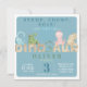 A cute, fun birthday party invite, featuring stone letters spelling out dinosaur with 4 different colored dinosaurs sitting on top of the letters. Personalize the invite with the name, age, party date and time, party address and RSVP details. If you wish to add any other text such as details on present ideas or surprise party details you can do this too!