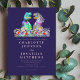 Celebrate your love with a roar! Perfect for dinosaur enthusiasts, this fun Jurassic dinosaur wedding navy blue and blush pink invitation features a colorful watercolor illustration of a dinosaur bride and groom standing in a vibrant wildflower meadow. Summer florals bloom in soft pink, green, purple, blue, orange, peach, and yellow tones, creating a joyful and romantic outdoor feel.