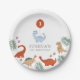 Dinosaur Boys First 1st Birthday paper plates features a pastel blue dinosaur holding a red balloon with the number 1 inside of the ballon in a colorful, fun dinosaur themed setting. Customize it with your child's age and name.