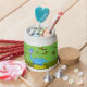 A happy dinosaur makes up this fun candy jar. Customizable so you can add your own text and change the background color. Makes a great gift!