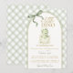 Cute and playful, this little dino baby shower invitation features an adorable baby dinosaur hatching from an egg, set against a sweet green gingham background with a pretty bow accent. Perfect for a dinosaur, prehistoric, or "a little dino is hatching soon" baby shower theme, this gender-neutral design is a fun and charming choice for parents who love all things dino.