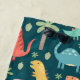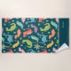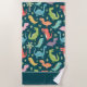 Add a custom Jurassic touch to the ocean trip of your little kid with this monogrammed dinosaur beach towel. Towel has a pattern of colorful dinosaurs on a dark blue background and your little one's first name and monogram in the bottom right corner. There are also palm trees and cacti.