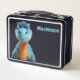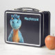 Personalized custom name lunch box with Ricaso with a funny scowling blue dinosaur