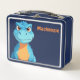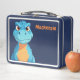 Personalized custom name lunch box with Ricaso with a funny scowling blue dinosaur