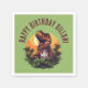 Fun kid's dinosaur themed birthday party paper napkins feature T-Rex with sunset and tropical plants on green background.