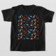 A pattern made out of seven colorful dinosaur silhouettes. There is a Tyrannosaurus Rex, a Pterodactyl, a Triceratops, a Velociraptor, a Stegosaurus, a Brontosaurus, and an Elasmosaurus.