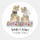 Fun dinosaur bride and groom in a beautiful colorful wildflower meadow a dinosaur theme wedding sticker to delight your guests. Easy to customize with the bride and grooms names and the wedding date in modern typography script. Funny Tyrannosaurus Rex bride and groom and watercolor summer floral illustrations in purple blue pink green yellow and orange hues. Unique original dino and summer floral artwork by artist Catherine Sweetman