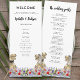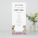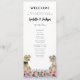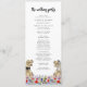 Funny dinosaur themed wedding day program with dinosaur bride and groom in a colorful prehistoric wildflower meadow. Easy to customize with the bride and grooms names, the wedding date and all the wedding day ceremony details in modern typography script. Fun T- Rex bride and groom dino and watercolor wildflower illustrations in blue pink purple orange yellow red and green hues. Unique original dinosaur and floral artwork by artist Catherine Sweetman