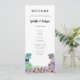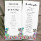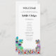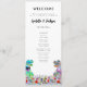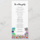 Funny dinosaur themed wedding day program with colorful T-Rex bride and groom in a beautiful prehistoric wildflower meadow. Easy to customize with the bride and grooms names, the wedding date and all the wedding day ceremony details in modern typography script. Fun Tyrannosaurus Rex bride and groom dino and watercolor wildflower illustrations in blue pink purple orange yellow red and green hues. Unique original dinosaur and floral artwork by artist Catherine Sweetman