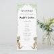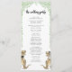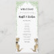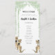 Funny dinosaur themed wedding day program with fun dinosaur bride and groom and watercolor eucalyptus foliage. Easy to customize with the bride and grooms names, the wedding date and all the wedding day ceremony details in modern typography script. T-Rex bride and groom dino illustrations in brown hues and watercolor botanical greenery in green hues. Unique original dino artwork by artist Catherine Sweetman