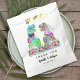 Delight your guests with these funny colorful wildflower dinosaur theme wedding thank you favor bags with fun dinosaur bride and groom and Jurassic jungle foliage. Easy to customize with the bride and grooms names, the wedding date in modern typography script. Funny Tyrannosaurus Rex bride and groom and beautiful watercolor wildflower illustrations in purple blue pink green yellow and orange hues. Unique original dino and summer floral artwork by artist Catherine Sweetman