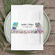 Delight your guests with this funny dinosaur themed wedding personalized belly bands. Fun psychedelic T-Rex bride and groom in a colorful prehistoric wildflower meadow with easy to customize bride and grooms names and the wedding date in modern typography script. Unique Jurassic dino Tyrannosaurus Rex bride and groom illustrations in blue pink purple yellow green and orange hues with watercolor summer florals. Original dino and wildflower artwork by artist Catherine Sweetman