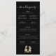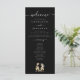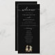 Dinosaur Wedding ceremony black and white Program card, elegant modern white script and funny T-Rex Bride & Groom on a sleek stylish black background.