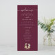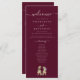 Dinosaur Wedding ceremony burgundy and cream ivory Program card, elegant modern white script and funny T-Rex Bride & Groom on a sleek stylish black background.