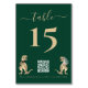 Bring a roar of personality to your reception with this whimsical dinosaur wedding personalized table number card featuring an adorable T-Rex bride and groom in soft brown and beige watercolor tones. Designed with a rich emerald dark green background and modern typography paired with elegant script, this card blends Jurassic fun with modern wedding style.