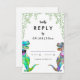 Colorful fun dinosaur themed wedding RSVP response card with funny dinosaur bride and groom with watercolor botanical greenery to bring prehistoric Jurassic jungle joy to your wedding day. Modern whimsical typography calligraphy with easy to personalize templates. Unique Tyrannosaurus Rex bride and groom in funky psychedelic colors with watercolor eucalyptus foliage original artwork by artist Catherine Sweetman Ideal for the wedding day reception or rehearsal dinner. Matching wedding suite includes everything you will need on your fun wedding journey