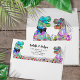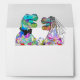 Fun colorful Dinosaur themed wedding return address envelope with funny T-Rex bride and groom in a prehistoric wildflower meadow to bring Jurassic joy to your wedding day. Modern whimsical typography calligraphy with easy to personalize templates. Unique colorful psychedelic Tyrannosaurus Rex bride and groom in blue green pink purple yellow and orange hues with watercolor wildflowers original artwork by artist Catherine Sweetman Ideal for the wedding day reception or rehearsal dinner. Matching wedding suite includes everything you will need on your fun wedding journey