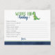 A flat baby shower game card with the 'Wishes for Baby' shower game printed on it. There is a small dinosaur graphic and ends with 'love,' along with a space for guests to sign their names.