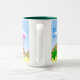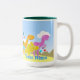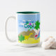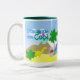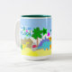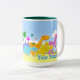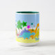 Dinosaurs Are Cool Name Mug. Cute colorful cartoon dinosaurs: yellow Diplodocus, pink baby dino egg, blue Stegosaurus, orange Diplodocus, sweet yellow Triceratops and purple T-Rex dinosaurs in a pre-historic stone age landscape with palm trees, mountains and vulcano and clouds in a blue sky personal drinking mug with Your Name. Add your name to make your unqiue special dinosaurs mug! This cool dino mug is fully customizable, add your images and texts. A great happy dino gift mug with your name on it!