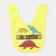 A yellow bib with three dinosaurs of red, blue, and yellow with text that reads Big Brother.