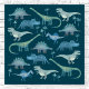 Lots of blue dinosaurs, Tyrannosaurus rex, Spinosaurus, Stegosaurus, Diplodocus and Triceratops on a deep teal background.