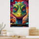 Whimsical and vibrant dinosaur that seems to be a blend of fantasy and prehistoric charm. The dinosaur has a long neck and a large head, featuring a wide-eyed expression with captivating, oversized eyes that give it a cute and curious look. Its skin is adorned with intricate patterns resembling colorful, swirling shapes and dots, almost as if its body is painted with a kaleidoscope of textures in blues, greens, yellows, and purples. The vibrant background, with its swirling skies and abstract planets, gives the impression of an otherworldly landscape, suggesting the dinosaur resides in a surreal, fantastical world. The bright, exaggerated colors and playful features give the creature a friendly, animated character, ideal for a magical or dreamlike setting.