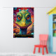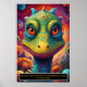 This dinosaur could belong to an imagined species from a cosmic realm, where flora and fauna thrive in vibrant, psychedelic ecosystems, blending prehistoric life with a space-age twist. Its demeanour exudes innocence and wonder, as though it’s exploring its fantastical universe for the first time.