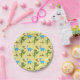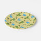 Yellow paper plates with blue dinosaurs, green dinosaurs and brown pterodactyls on a yellow background. Background color of plates can be customized. These go great with our matching paper cups and party hats.