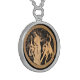 Medium round sterling silver necklace with a black and gold image of Dionysus god of wine and wine making and ritual madness, and the satyrs on black. In mythology, a satyr is a wood-dwelling creature with the head and body of a man and the ears, horns, and legs of a goat. Satyrs were characterized as being fond of lechery and drunken merriment. See the entire Toga Necklace collection in the PARTY FAVORS section.