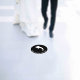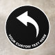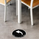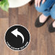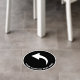 Simple black circular directional floor decal sign to guide your customers or visitors with a white left turn arrow and your text in easy to read white typography.