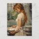 The image depicts a young woman with long, flowing blonde hair, delicately washing dishes by a window. She is dressed in a vintage-style cream dress with lace sleeves, evoking a serene, nostalgic atmosphere. The soft lighting and detailed brushstrokes give the scene a warm, almost painterly quality, reminiscent of classical art. The lush garden visible through the window adds a touch of natural beauty, complementing the peaceful, domestic setting.