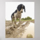 Dirty dog looking at tennis ball in mud poster