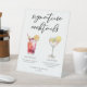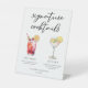 This chic signature cocktails menu pedestal sign features custom black typography above 2 drinks and their ingredients for your wedding bar. A cute Dirty Shirley Temple and Lemon Drop martini drawing add a cool flair to your bar menu. Complete with the couple's names and date for their reception.