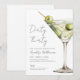 A watercolor green martini glass with olives sits on the right side, giving the layout a fresh, grown-up vibe. The vertical format keeps things clean and minimal, with party info laid out in a crisp mix of serif and script fonts.
