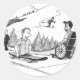 Disability Ability. Four people at a ski resort. One man walks, one uses a wheelchair, a legless man rides a skateboard, and a one legged woman is skiing. Concept by Lee Serenethos; Drawn by Terry Wampler.
