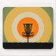 This graphic design features colorful rings around a silhouette disc golf basket and grass.