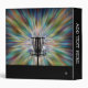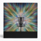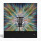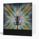 Enjoy this graphic design of a disc golf basket with chains and a colorful background.