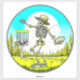 A skeleton playing disc golf in the woods. Retro pop art cartoon style.