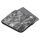 Disco ball ornaments of various sizes form a chaotic pile in this unique black and white photograph. The shiny mirror balls reflect bright light or dark shadows from each of their small mirrored facets. The glitter ball ornaments rest on top of garlands with reflective silver dodecahedron beads.