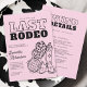 Disco Cowgirl Bachelorette Party Weekend Itinerary Invitation features bold black outlined text, a disco ball, western boots, and a cow print cowgirl hat, all on a light pink background. Perfect for celebrating the bride’s final ride with a country chic Nashville weekend or girls' trip. The backside includes a full weekend schedule to keep your bride tribe on track. Personalize with your party details and get ready to saddle up!