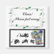 Dishwashing magnet that has "Clean! Please out away! and Do not use! Dirty!" The clean side has a vine around it, and the dirty side has a border around it and a stack of dirty dishes.