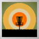 This graphic design features colorful rings around a silhouette disk golf basket and grass.