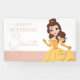 This personalized birthday banner showcases Belle from Beauty and the Beast, gracefully poised in her signature golden gown. The design features soft pink accents, a charming polka-dot pattern, and customizable text for the birthday celebrant’s name. Ideal for princess-themed parties, the banner adds a touch of Disney magic and elegance to any celebration. Crafted with vibrant colors and a whimsical aesthetic, it creates a memorable backdrop for special occasions.