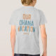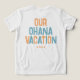 A tropical family vacation shirt design showcasing a beautiful beach scene with two tall palm trees leaning toward each other over turquoise waters and a sandy island. The front features a customizable name in bold orange letters beneath the artwork, while the back reads “OUR OHANA VACATION” in playful orange and blue lettering, along with a customizable year. Perfect for matching family outfits on Hawaiian getaways, tropical cruises, or sunny beach vacations, making your trip even more memorable.