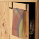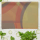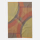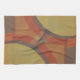 Dissolution kitchen towel. Dissolution is an abstract design created by Anna M. Asbury and consists of red, orange, olive and gray circles and rectangles.