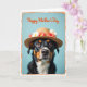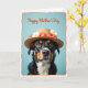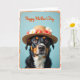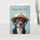 This card shows a tri-color dog centered on the front, gazing straight out with big brown eyes that feel like a gentle, friendly invitation ❤️. The dog wears a straw hat trimmed with small white daisy-like flowers and a few red rosebuds, adding a sweet, affectionate touch to the scene. Its black coat is marked with tan and white patches, especially around the chest and muzzle, and the soft lighting brings out the fur’s texture and the hat’s woven strands. Behind the dog is a powder-blue background that keeps everything calm and focused on the face and flowers 🌼. Near the top, an orange message is placed above the dog in flowing lettering, standing out clearly against the blue. A worn-looking orange border frames the whole design, giving it a cozy, old-fashioned feel. Small details like the slight shine on the dog’s nose and the layered petals of the blossoms are easy to spot within the orange frame.