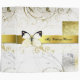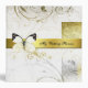 Lovely custom binder done in a white background, with distressed pattern of gold tone and silver swirls and flourishes. Graphics of a gold tone band runs across the middle of the binder, with a lovely white and black butterfly decorating the band. Text in black is customizable to read what you want. Great for organizing all your wedding ideas. Inserts and pages sold separately at your local craft, office, or discount stores.