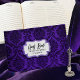 Gothic inspired wedding guest book done in a black and purple distressed damask. Graphics of a purple and white decorative text area, on the front, has custom text ready to personalize.