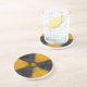 Sandstone coaster with a distressed yellow and gray radiation symbol.